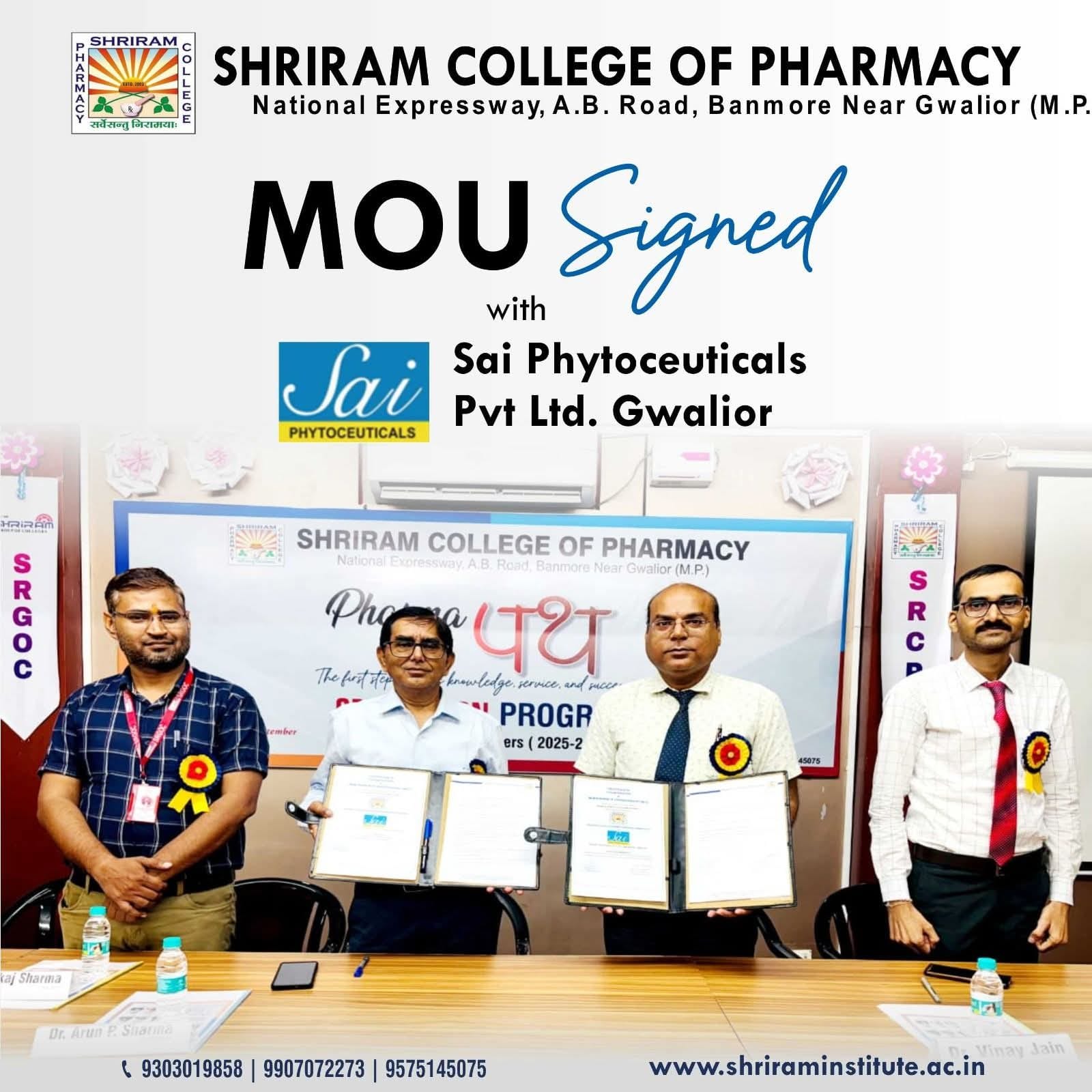 MoU with Sai Phytoceuticals Pvt. Ltd. (Malanpur, Gwalior) On 18th September 2025, SRCP entered into an MoU with Sai Phytoceuticals Pvt. Ltd., a reputed name in phytopharmaceuticals. This partnership focuses on: Skill-based training programs for students Knowledge exchange between academia and industry experts Internship and placement opportunities for budding pharmacists Industrial site visits to provide real-time exposure Expert lectures and research collaboration for academic enrichment