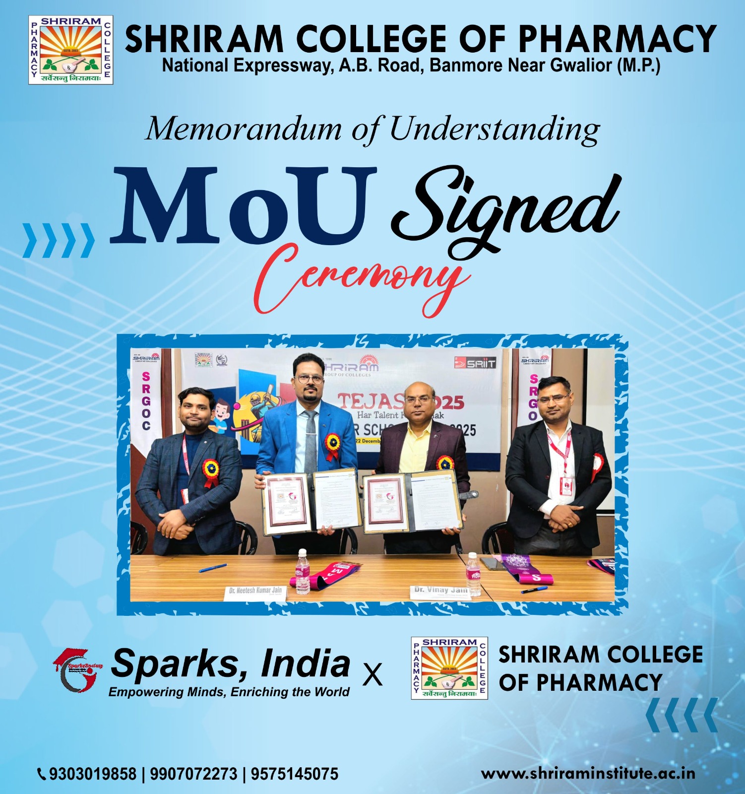 We are thrilled to announce a significant milestone for Shriram College of Pharmacy. We have officially signed a Memorandum of Understanding (MoU) with Sparks, India. On 19 January 2026